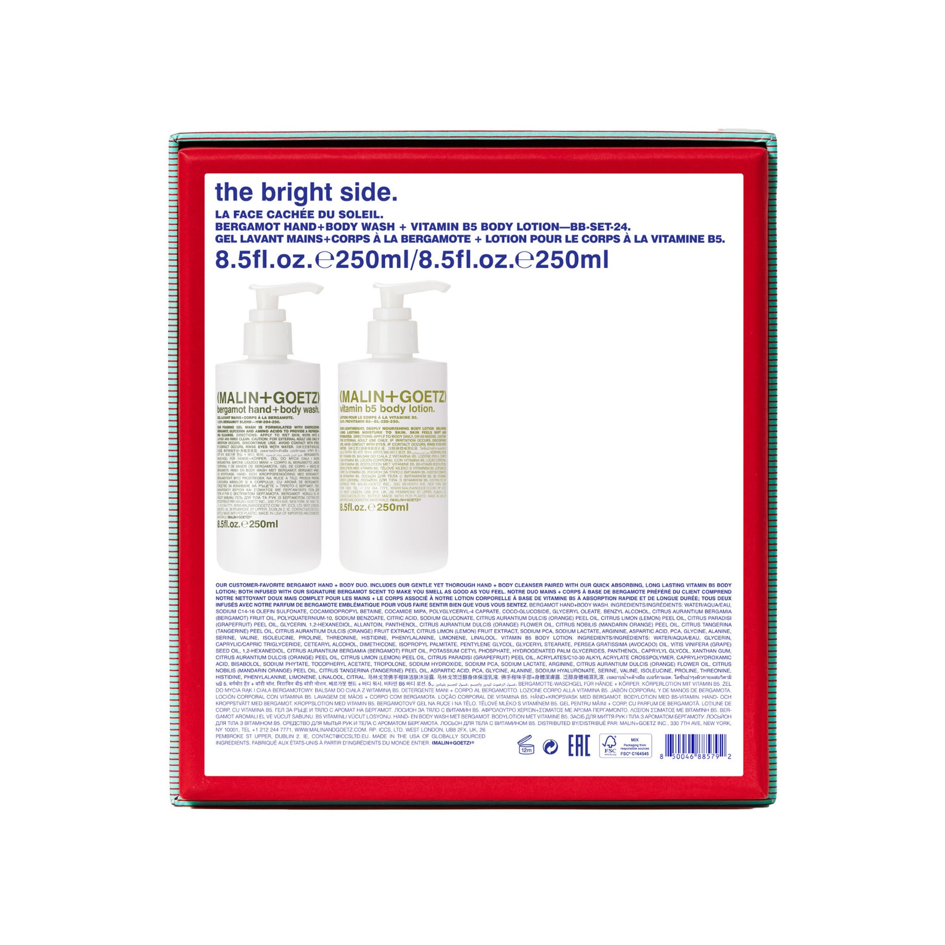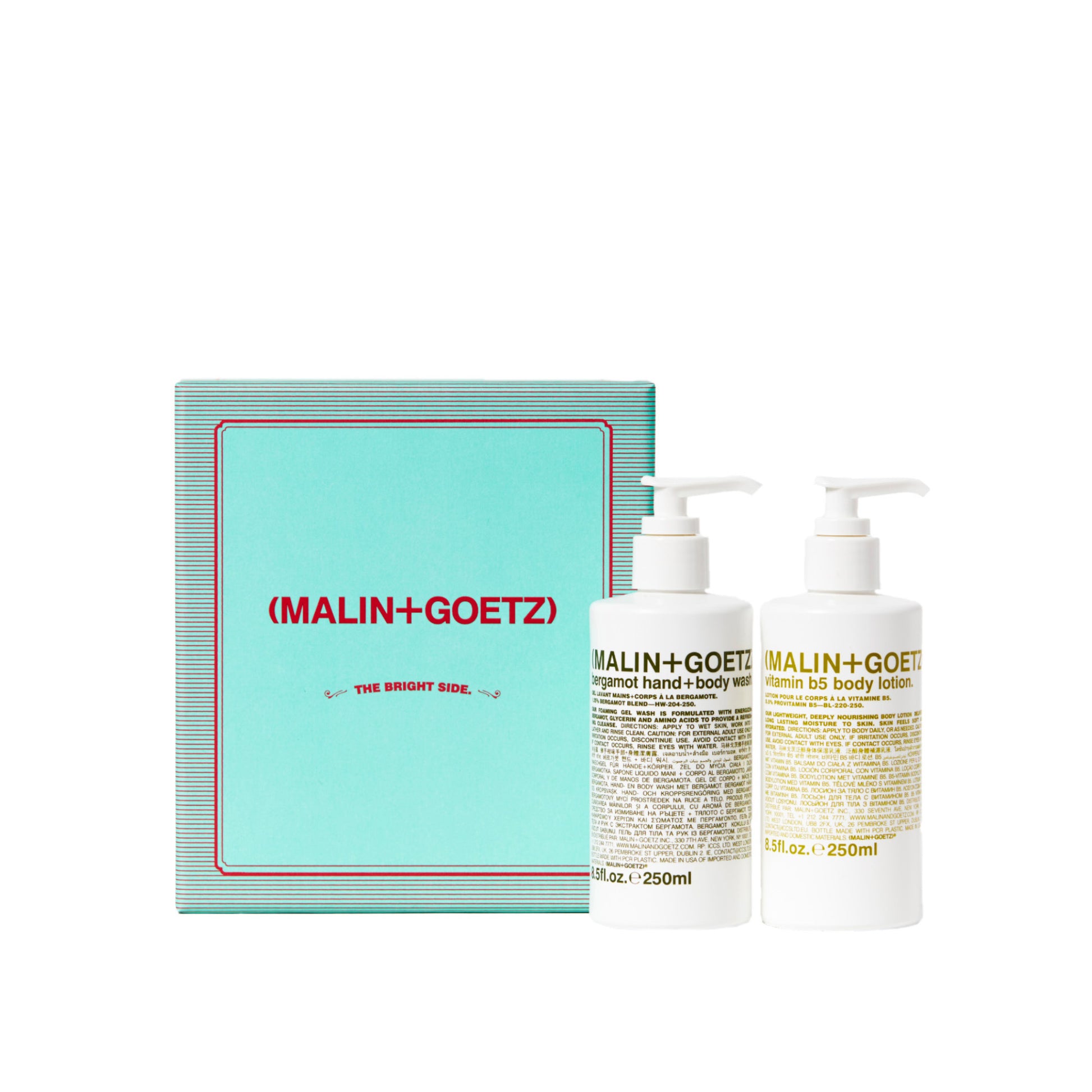 Bergamot Hand+Body Wash: Ingredients: Water/Aqua/Eau, Sodium C14-16 Olefin Sulfonate, Cocamidopropyl Betaine, Cocamide Mipa, Polyglyceryl-4 Caprate, Coco-Glucoside, Glyceryl Oleate, Benzyl Alcohol, Citrus Aurantium Bergamia (Bergamot) Fruit Oil, Polyquaternium-10, Sodium Benzoate, Citric Acid, Sodium Gluconate, Citrus Aurantium Dulcis (Orange) Peel Oil, Citrus Limon (Lemon) Peel Oil, Citrus Paradisi (Grapefruit) Peel Oil, Glycerin, 1,2-Hexanediol, Allantoin, Panthenol, Citrus Aurantium Dulcis (Orange) Flower Oil, Citrus Nobilis (Mandarin Orange) Peel Oil, Citrus Tangerina (Tangerine) Peel Oil, Citrus Aurantium Dulcis (Orange) Fruit Extract, Citrus Limon (Lemon) Fruit Extract, Sodium Pca, Sodium Lactate, Arginine, Aspartic Acid, Pca, Glycine, Alanine, Serine, Valine, Isoleucine, Proline, Threonine, Histidine, Phenylalanine, Limonene, Linalool: Vitamin B5 Body Lotion: Ingredients: Water/Aqua/Eau, Glycerin, Caprylic/Capric Triglycerides, Cetearyl Alcohol, Dimethicone, Isopropyl Palmitate, Pentylene Glycol, Glyceryl Stearate, Persea Gratissima (Avocado) Oil, Vitis Vinifera (Grape) Seed Oil, Potassium Cetyl Phosphate, Citrus Aurantium Bergamia (Bergamot) Fruit Oil, Hydrogenated Palm Glyceride, 1,2-Hexanediol, Caprylyl Glycol, Panthenol, Xanthan Gum, Citrus Aurantium Dulcis (Orange) Peel Oil, Citrus Limon (Lemon) Peel Oil, Citrus Paradisi (Grapefruit) Peel Oil, Acrylates/C10-30 Alkyl Acrylate Crosspolymer, Bisabolol, Sodium Phytate, Tocopheryl Acetate, Sodium Hydroxide, Citrus Aurantium Dulcis (Orange) Flower Oil, Citrus Nobilis (Mandarin Orange) Peel Oil, Citrus Tangerina (Tangerine) Peel Oil, Sodium Pca, Sodium Lactate, Arginine, Aspartic Acid, Pca, Glycine, Alanine, Sodium Hyaluronate, Serine, Valine, Isoleucine, Proline, Threonine, Histidine, Phenylalanine, Limonene, Linalool, Citral.
